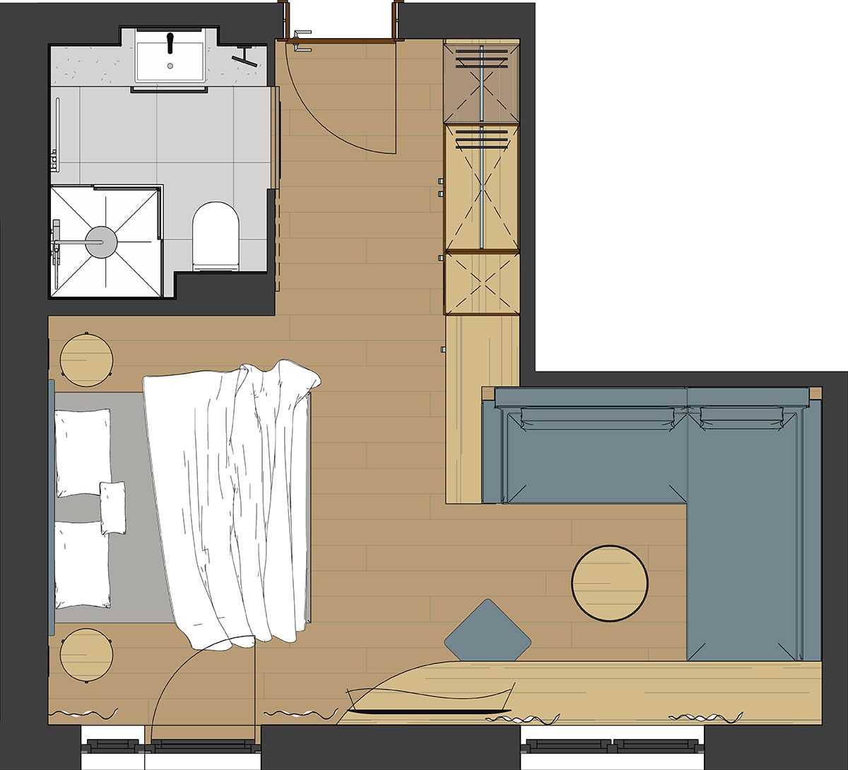 Im Frühling 2025 neu renovierte Zimmer mit edlen Stoffen in harmonischen Erdtönen.